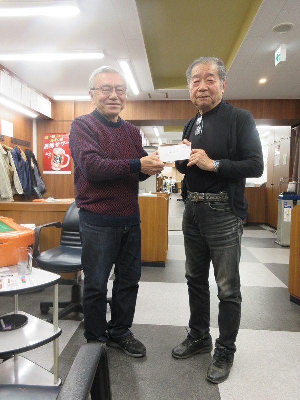 令和7年度支部麻雀大会(後期)を去る12月11日(木)に新宿メトロ南口店にて開催しました。 当日、急遽1名の欠席者が出てしまい、参加者の了解を得て1卓だけ3名での実施となりましたが、 牧 強さんと関 俊夫さんの新メンバー2人を含む15名により和やかな雰囲気での熱戦が行われました。 ゲームは開始早々から跳満上がりがあちこち出て、 準備した先着5名までの跳満願賞が瞬く間に無くなる等 波乱含みの展開でしたが、5時間近くの激戦の結果、 優勝は野中和徳さん、準優勝は安池 透さん、第3位は谷口 博さん、飛び賞5位は本多郁郎さん、 第7位賞は本多慶成さん、第9位賞は日野朝夫、BB賞は牧 強さんでした。 今回も中間で一休みして缶ビール等で乾杯し、情報交換の時間を設け楽しい大会となりました。 |